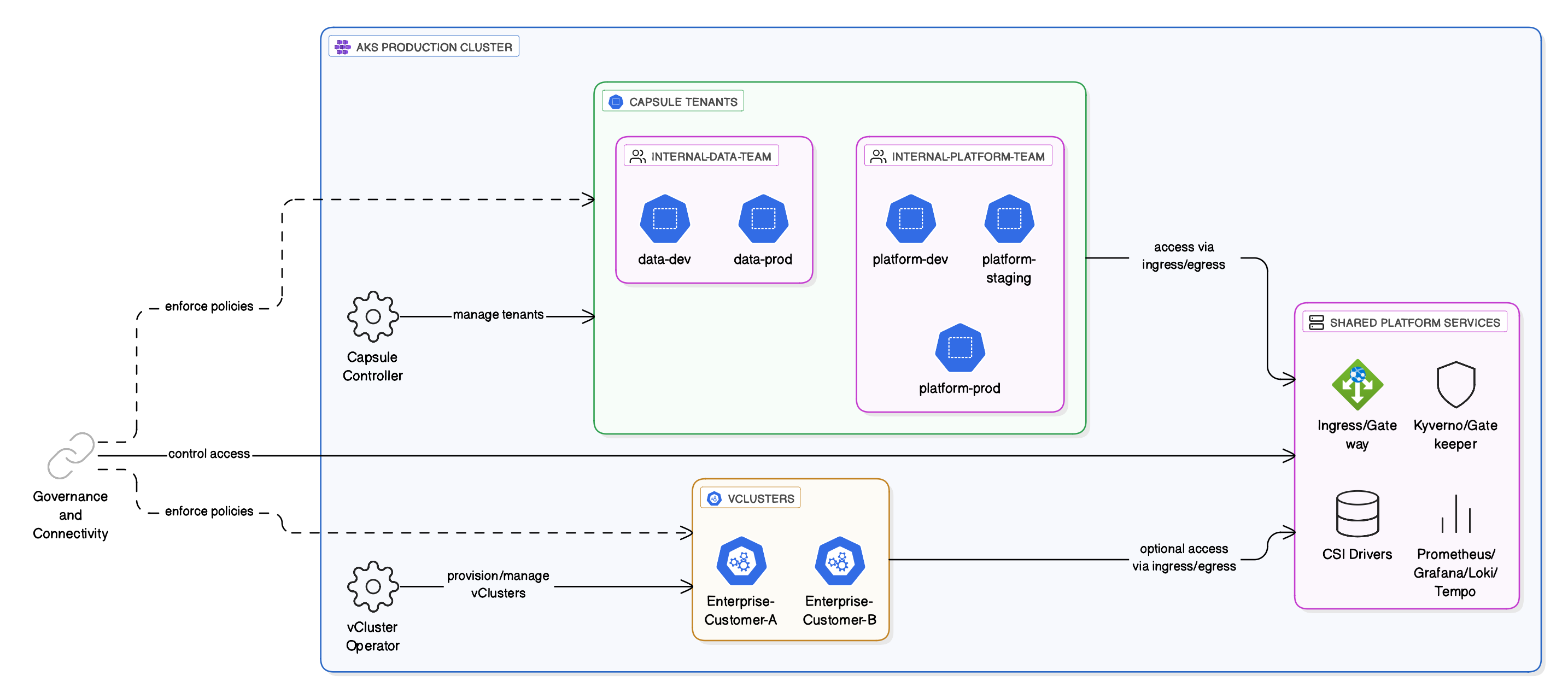 - Centralized governance: Platform team controls policies, tenants self-serve within guardrails