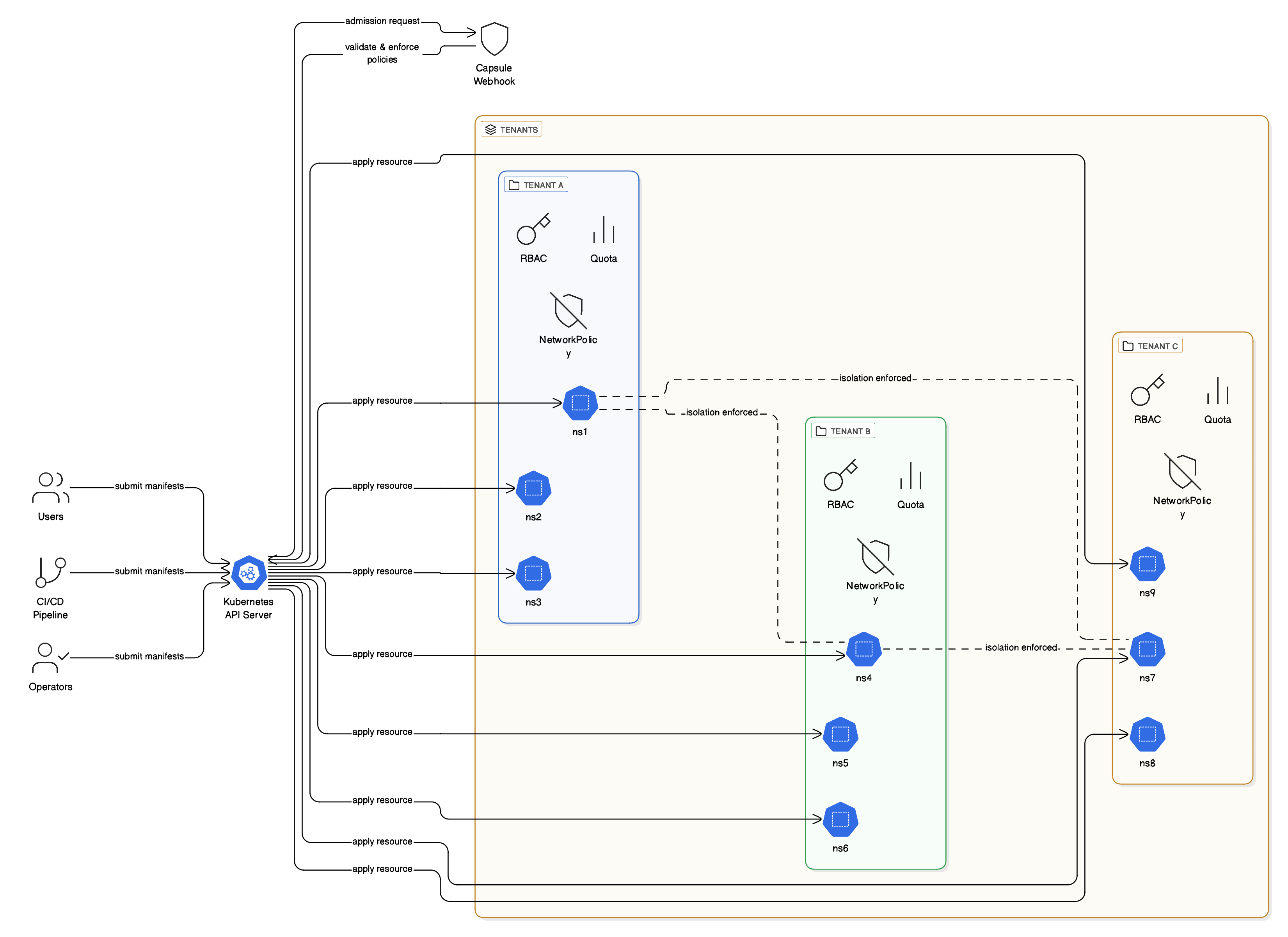 When a tenant owner tries to create a namespace or resource, Capsule’s admission webhook intercepts the request and validates it against tenant policies. If it passes, the resource is created with automatic labels, annotations, quotas, and network policies applied.